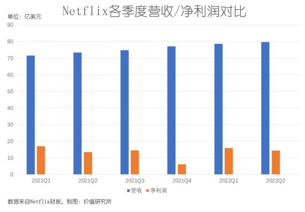 从数据来看,营收、利润表现没有多大改善,但尚算稳定。历史数据显示,去年二季度至今年一季度,Netflix净营收分别为73.42亿、74.83亿、77.09亿和78.68亿美元,一直徘徊在70-80亿美元区间内。