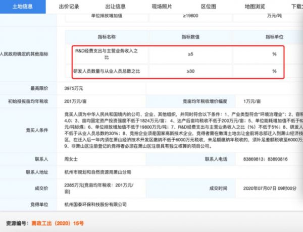 值得注意的是,上述研发中心项目“拿地”期间疑点重重,公司研发人员占比与研发中心地块的拍卖准入要求不符。据浙江省土地使用权网上交易系统公示的萧政工出(2020)15号地块(即国泰环保研发中心项目地块)公示信息,“县级以上人民政府确定的其他指标及‘竞买人条件’均要求‘研发人员数量与从业人员总数之比≥30%’、‘研发人员数量不低于从业人员总数30%’。”