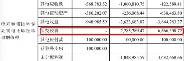 在国泰环保披露的会计差错中,其中一项即为绍兴泰谱因环保处罚退还即征即退增值税,其中应交税费合计超800万元。公司方面向钛媒体APP回应表示:“2017年9月,绍兴泰谱受到处罚10万元。2017年10月至2019年12月期间,绍兴泰谱仍参照目录违规享受税收优惠共计742.75万元。公司已补缴上述款项。当地税务局出具证明,绍兴泰谱无被税务机关查处的税收违法行为。”