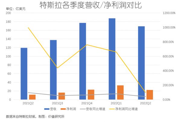 另一方面营收、净利润的同比增速较去年同期和第一季度大幅缩水。去年二季度至今年一季度,特斯拉净利润同比增速分别高达998%、439%、760%和656%,一直保持在三位数以上。今年二季度98%的同比增速,已较巅峰时期跌去九成。