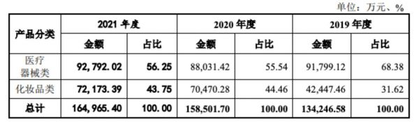 报告期内,医疗器械类销售业务占主营业务收入比例为68.38%、55.54%和56.25%,为敷尔佳收入的主要来源。但是,以功能性护肤品为主的化妆品类产品收入占比正在逐年提升。