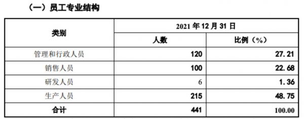 截至2021年末,敷尔佳共有员工441人,其中研发人员仅有6人,占总人数的1.36%,销售人员则多达100名,占比22.68%,生产人员215人,占比48.75%。
