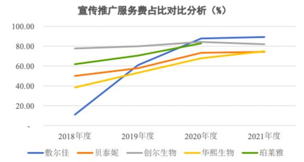 深交所此前还就宣传推广费的持续增长,在问询函中要求敷尔佳说明形象宣传推广费用相关服务商的基本情况。在回复中,敷尔佳列出了与市场其他公司的对比,2020年、2021年,该公司的宣传推广费用占比在业内属于“一骑绝尘”。