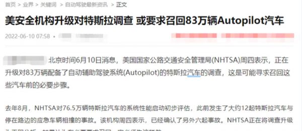 特斯拉在欧洲遇到安全问题不是孤例。在6月初,特斯拉同样因为安全问题被美国安全机构升级调查,并要求其召回83万辆已售车辆。