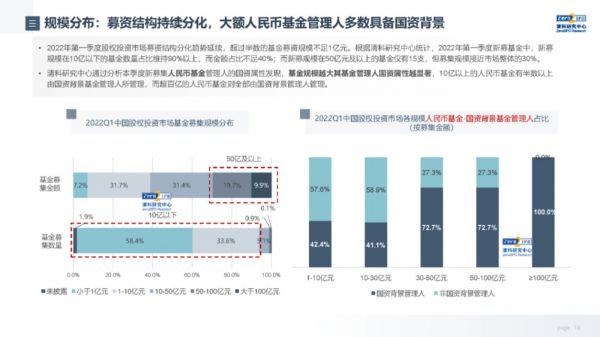 清科研究中心报告显示,在2022年第一季度的募资市场中,募资结构持续分化,大额人民币基金管理人多数具备国资背景。具体而言,通过分析新募集人民币基金管理人的国资属性发现,基金规模越大其基金管理人国资属性越显著,10亿以上的人民币基金有半数以上由国资背景基金管理人所管理,而超百亿的人民币基金则全部由国资背景管理人管理。