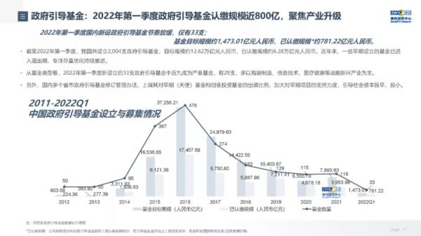 先来看一组数据——清科创业(1945.HK)旗下研究中心统计,截至2022年第一季度,我国共设立2004支政府引导基金,目标规模约12.62万亿元人民币,已认缴规模约6.28万亿元人民币。具体到一季度,新设立政府引导基金33支,目标规模超1400亿元人民币,认缴规模近800亿元人民币,其中近9成为产业基金,多以高端制造、信息技术、医疗健康等战略新兴产业为主。