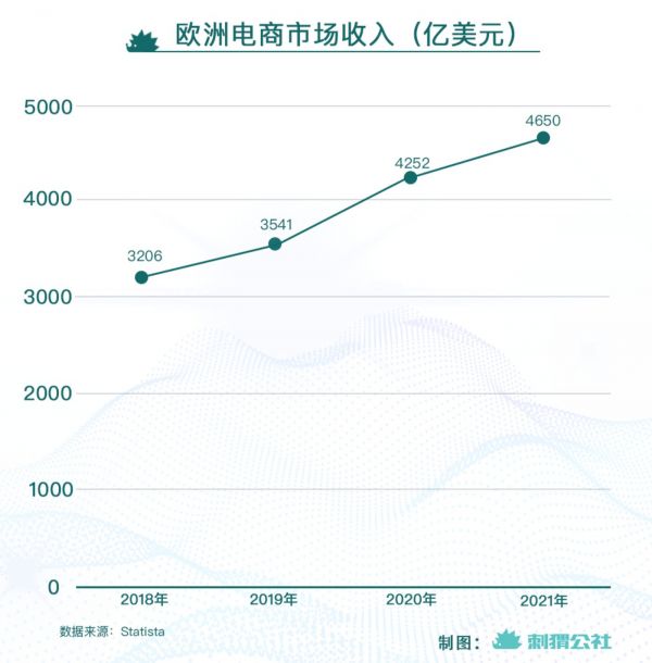 同样的趋势也发生在欧洲各国。疫情暴发前的2019年,欧洲电商总收入为3541亿美元,到2021年底,这个数字涨到4659亿美元,两年间涨幅超过30%。