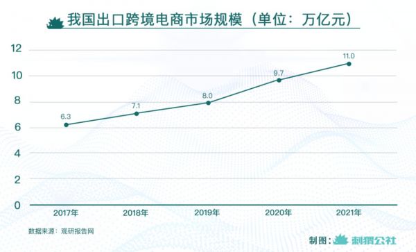 根据招商证券相关报告,2020年,中国跨境电商在外贸中的渗透率已高达39%,且在海外线上消费高速发展的驱动下,跨境电商对出口业务的贡献度逐年攀升。根据观研报告网相关数据,从2017年到2021年,我国出口跨境电商市场规模实现翻倍,其中疫情初期的2020年,增速高达20.79%。