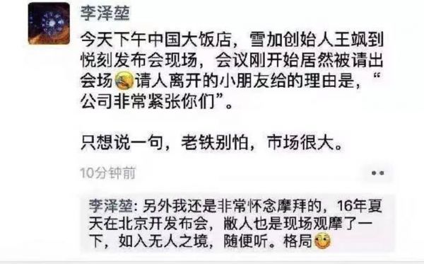 王飒站在了会场外,拿出手机发了一条讽刺悦刻格局不大的朋友圈。雪加的联合创始人李泽堃也在朋友圈为王飒声援,说怀念当时摩拜让人随便听发布会。