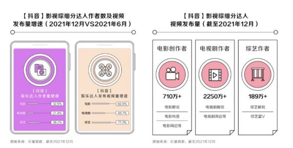 更为「可观」的数字是,截止到2021年12月,抖音平台上的娱乐领域达人超过9.2万人,这些创作者分布在电影、电视剧和综艺三大类型中,增长速度均超过20%,尤其爆炸的是电视剧领域创作者,其发布量超过2250万条。