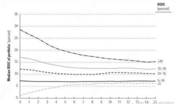 但如果用ROIC(资本回报率)这个指标回测,虽然不同水平的ROIC的公司同样有向平均水平收敛的趋势,但最终还是有相当大的差别。