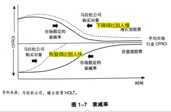 这个体系用“衰减率”代表行业或公司从周期高点和低点分别向下和向上回归正常水平时的速率。以平均回报为基准,成长与价值分列上下两部分,有不同的特征: