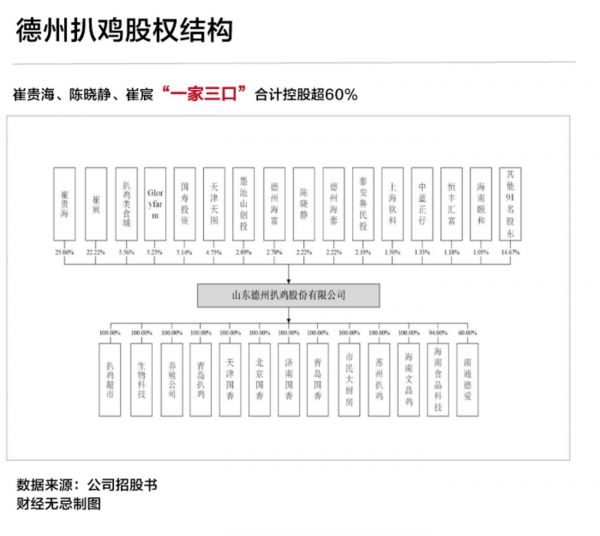 据招股书,崔贵海、陈晓静、崔宸三人持有德州扒鸡股权比例分别为25.06%、2.22%与22.22%,一家三口合计控股超60%。