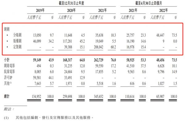 成立于2016年的耐看娱乐,乘着网剧大爆发的风口而生。从其招股书披露的数据来看,公司最初以创作分账剧与版权剧为主。但自2020年阿里向其注资后,耐看娱乐与阿里系的优酷越走越近,与之相伴,耐看娱乐的定制剧业务由此开始,2021年,公司来自定制剧的营收达到2.08亿,占总营收的60%以上。