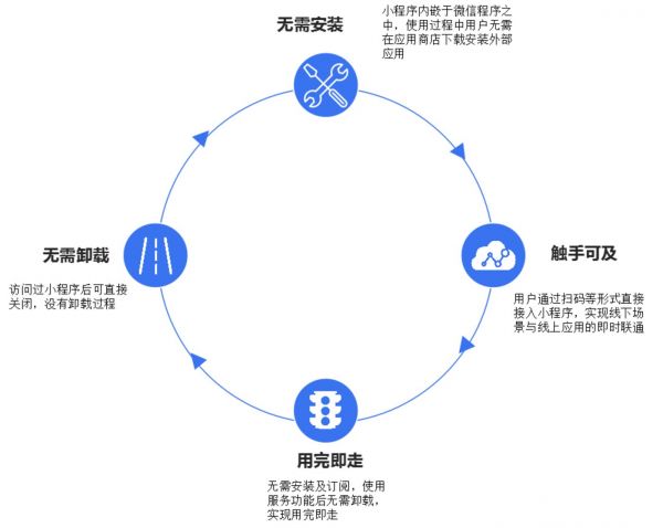 开发管理简单,降低获客成本,对企业和中小企业而言,小程序本质上释放了中小企业开发原生App 的负担,也降低了用户使用低频App的成本。可装不可装的APP统统不装,在小程序上直接实现使用,用完即走,最多收藏下经常用的那几款。