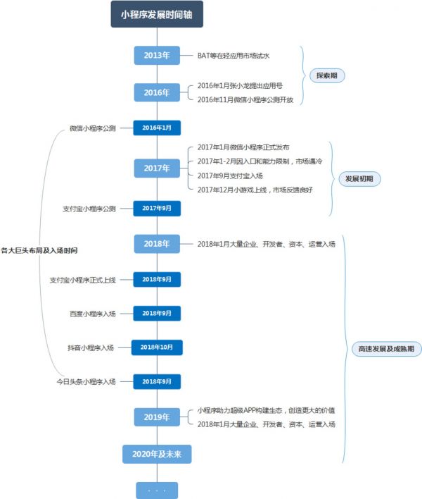 小程序最早由于微信之父张小龙在2016年1月提出,2017年正式上线,2019年现在微信日活破2.3亿以上,超过260万个小程序,发展迅猛。在这个过程中,各大拥有超级APP的巨头们,逐渐集中注意力瓜分小程序流量。2019年号称小程序元年,无论是支付宝小程序团队的几十个月年终奖,还是现在无处不在的小程序,都告诉大家一件事——小程序已经融于生活,并且消灭了很多腰部APP的存在空间,逐渐演变为小程序生态(类似于应用商城)。