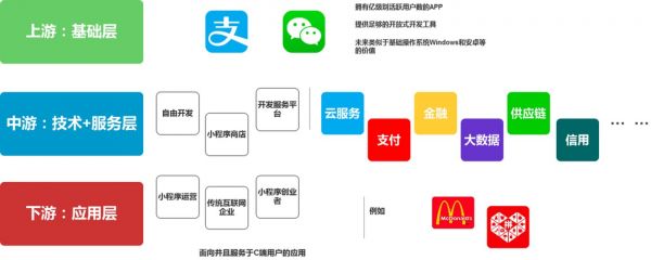 中游(技术+服务层):第三方服务平台:以专业小程序开发为主,为各行业及商户提供小程序开发;腾讯和阿里巴巴基于自身庞大的B端+C端用户而建立的云服务、金融、大数据等一些列服务;