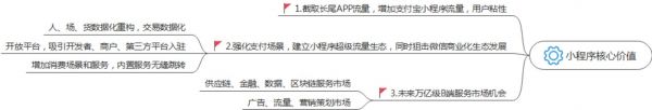 以社交流量为载体——微信信息传播流量为载体——今日头条、UC以交易属性为载体——支付宝、苏宁金融等2. 小程序的产生与特点