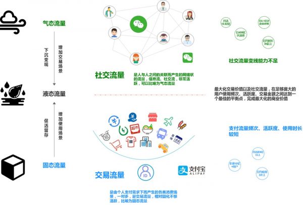 支付宝流量,具备支付属性,由单个个体产生各项与支付相关的流量,活跃度和频次不够,是固态流量;微信流量,具备社交属性,属于多个人之间关联和产生的社交流量,过于活跃,是气态流量。