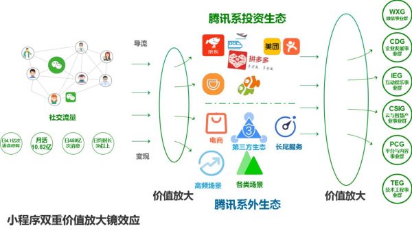 ①小程序和导流和变现,转化社交流量,导流腾讯系投资生态,变现流量;