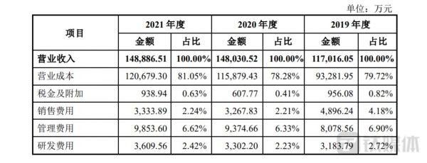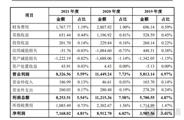 2019年至2021年,香江电器营收分别为11.7亿元、14.80亿元及14.89亿元。其中,2020年营收比2019年同比增长了26.5%。这是由于2020年新冠疫情爆发,人们居家时间变长,家居类用品大卖。报告期内,公司净利润分别达3986万元、8913万元及7168万元。营收与净利润的增长趋势大致相同,都在2020年出现较大幅度增长,并在2021年出现增长放缓现象。