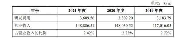 值得注意的是,香江电器的生产模式以ODM/OEM模式为主,近三年来该模式下的收入占营收比重都在90%以上,分别为95.44%、93.81%及93.72%。这也说明了公司主要依靠代工,自主研发、设计的成分较低。这从香江电器近三年来的研发投入及其研发占比便可窥见。