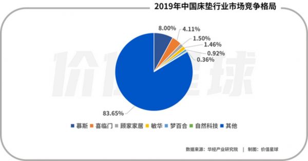 除了业绩上不如行业龙头,趣睡科技的市占率也没有像石头科技那样“一飞冲天”。华经产业研究院数据显示,2019年中国床垫行业CR5的企业合计占据了15.99%的市场份额,其中排名第五的梦百合占比约0.92%,而趣睡科技榜上无名。这也意味着,趣睡科技床垫产品的市场份额连1%都不到。