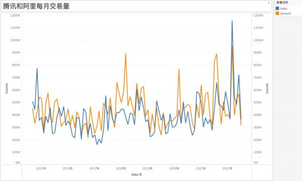 为强化对比,我们制作了腾讯和阿里(以纽交所为主)两家公司的每日交易量情况,见下图