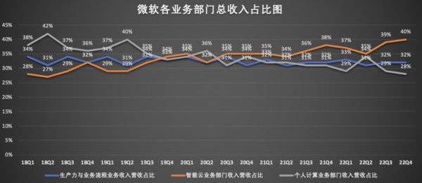 微软个人计算部门主要包括Windows、Xbox和Surface。2022财年Q4,微软个人计算部门收入143.56亿美元,同比增长2%,在总收入中的占比从上一财年同期的31%,下降至本季度的28%。
