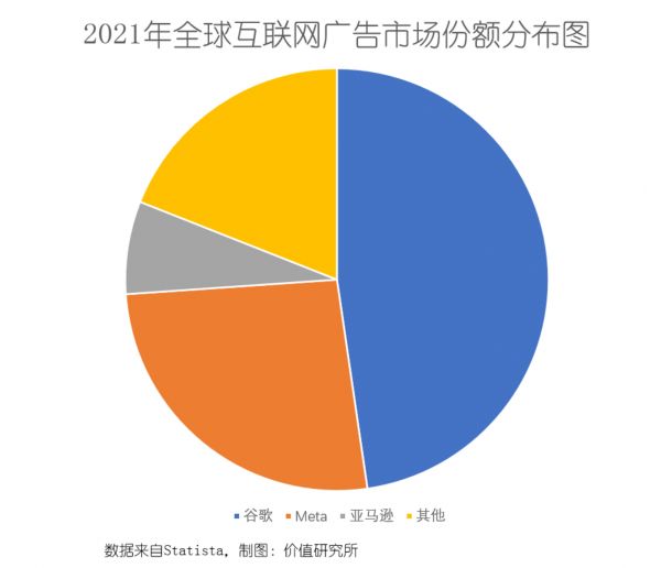 毫无疑问,全球互联网广告市场体量依然巨大,谷歌的市场份额也是独步天下。Statista统计的数据显示,截止2021年全球互联网广告市场规模超过4600亿美元,占广告市场整体收入的比例也达到51%,且占有率已经连续六年上升。