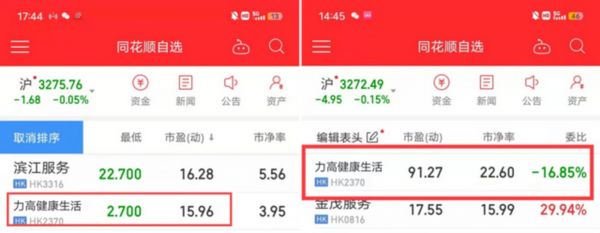 今日忽然发生变故。下午开盘时,力高健康生活市盈率还在91.27,收盘就跌到了15.96,暴跌82.79%。