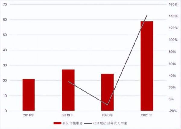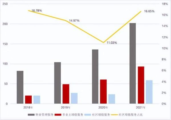 但总结了2018-2021年的数据,社区增值服务的收入占比,在2021年仅有16.65%,比起非业主增值服务还要低上很多。