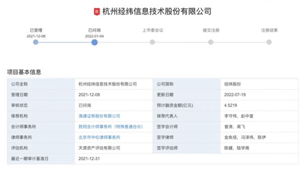 2021年12月8日,杭州经纬信息技术股份有限公司(简称为“经纬股份”)正式向深交所提交了招股说明书,拟在创业板上市。