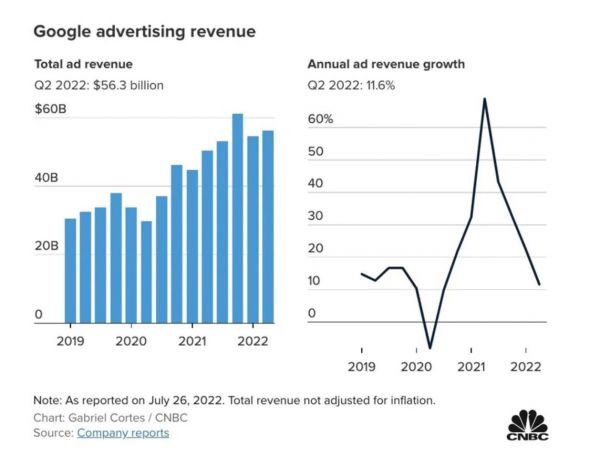 跟Meta一样同为广告大户的谷歌,虽然此次也交出了一份并不好看的财报,但却因最为关键的广告业务没有垮台而逆势大涨。