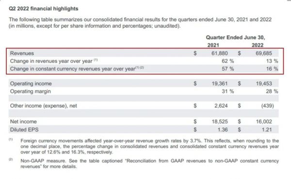 从各项关键指标来看,谷歌本次的财报几乎全部低于市场预期。谷歌第二季度营收696.9亿美元,逊于分析师预期为700亿美元;每股盈利1.21美元,低于分析师预期为1.32美元;净利润160.02亿美元,与上年同期相比下降13.6%。
