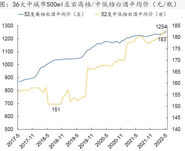 据国元证券研究所数据,到2022年7月,高档白酒的平均价已经在1200元以上。然而,这个价位上茅台、五粮液、洋河和泸州老窖位置稳固,挑战难度较大。