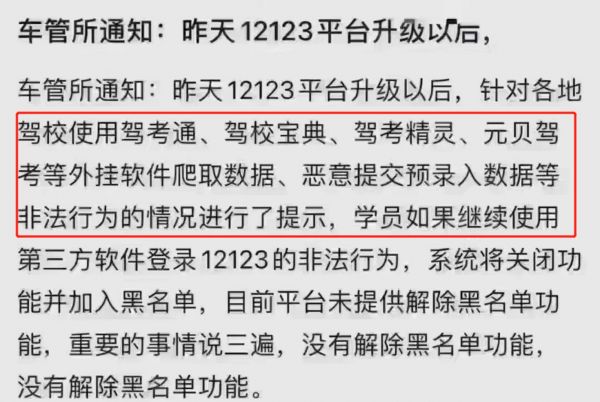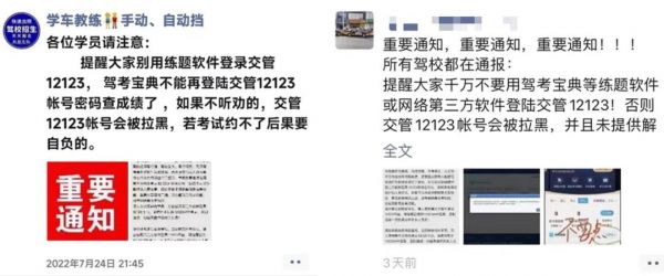 近期,有网友反馈,全国多地的驾校教练都在朋友圈转发一条消息,用以提醒学员不要再用驾考通、驾校宝典、驾考精灵、元贝驾考等第三方软件登录交管12123APP,如果不听劝,学车用户的交管12123账号会被拉黑,考试也无法预约。