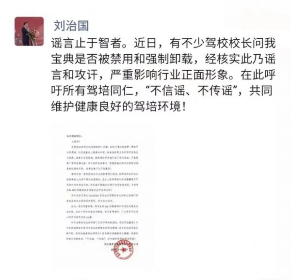 驾培协会秘书长刘治国朋友圈辟谣 来源:朋友圈截图