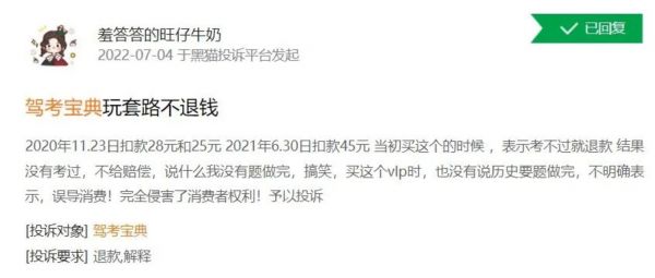 7月份,已经有用户在黑猫投诉平台上投诉,驾考宝典“玩套路”,因做不完题去考试,拒绝赔偿。