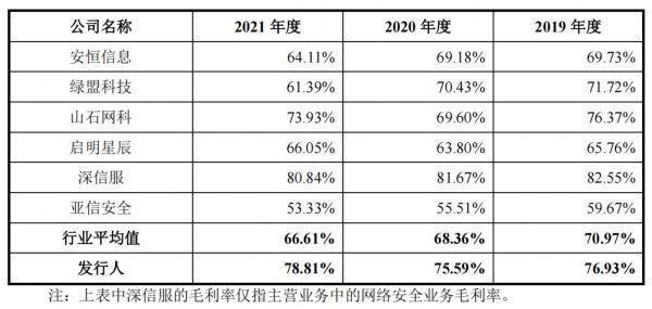 报告期内,公司主营业务毛利率分别为76.93%、75.59%、78.81%,均超过几家行业龙头,仅次于深信服。同期同行业可比公司毛利率均值为70.97%,68.36%,66.61%,呈下降趋势,而盛邦安全的盈利能力却实现了逆势增长。