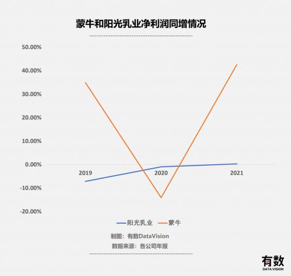 阳光乳业的一部分原奶采购自现代牧业,也就是蒙牛的小老弟。于是,阳光乳业一边苦哈哈过日子,另一边,拿捏了奶源的蒙牛却笑开了花。2021年蒙牛净利润同增42.6%,产自自家牧场的低温鲜奶“每日鲜语”功不可没。