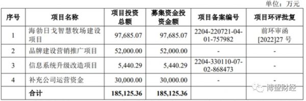 以认养一头牛为例,据招股说明书显示,拟首次公开发行不超过4047.06万股人民币普通股(A股)股票,募集资金18.51亿元,其中:9.77亿元用于海勃日戈智慧牧场建设项目;5.2亿元用于品牌建设营销推广项目;0.54亿元用于信息系统升级改造项目;剩余3亿元用于补充运营资金。