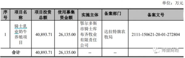 再比如骑士乳业,招股说明书显示,拟向不特定合格投资者公开发行不超过5227万股股票,募集资金2.61亿元,全部用于奶牛养殖项目。此项目拟购置并养殖泌乳牛3500头,项目建成后牧场将实现年新增鲜奶产能4万吨。