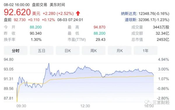 而同一时间,阿里巴巴美股股价报92.62美元,总市值2453亿美元;