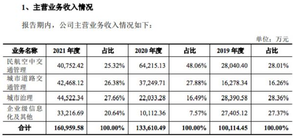 招股书显示,莱斯信息主营业务为面向民航空中交通管理、城市道路交通管理及城市治理三大行业,提供提供空管自动化系统、空管场面管理系统、机场机坪塔台管制自动化系统、空管模拟机系统、空管流量管理系统、交通信号控制系统与设备、城市综合指挥平台、公共信用信息服务平台及人防应急指挥信息系统等核心产品。