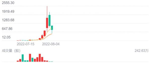 据数据计算,自美东时间7月15日纽交所上市,尚乘数科股价从每股发行价7.8美元开始,连续13个交易日暴涨。截至8月2日收盘,该股报收于1679美元,较发行价格已上涨215倍,市盈率高达13560倍。