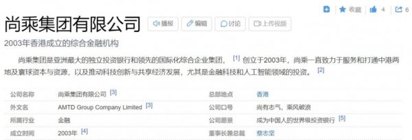 如果说尚乘数科的股价表现大起大落刺激万分,那么支撑起股价的业务与结构更近乎疯狂。据官网显示,尚乘数科是尚乘集团(AMTD Group)旗下的一家数字金融公司。而百度百科词条显示,尚乘集团由李嘉诚的长江实业集团与和记黄埔于2003年创立,主要业务包括资产管理、投行、保险经纪。