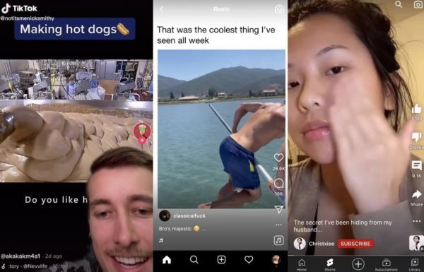 短视频应用界面都相似 从左到右:TikTok、Reels、Short