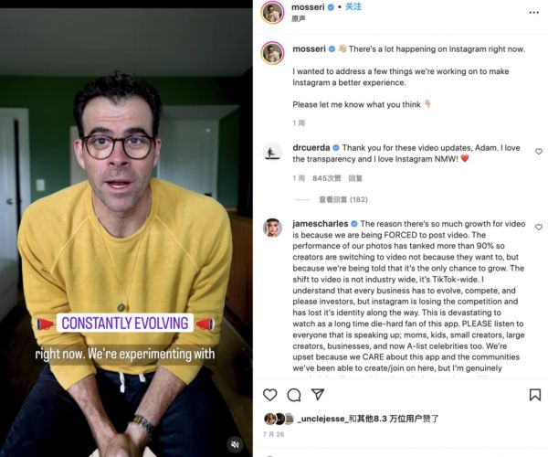 这场抗议让Instagram负责人Adam Mosseri(亚当·莫塞里)不得不出面直接回应,在7月26日的一个Instagram视频中,他解释了三件事:一、App的功能产生变化是在不断测试,承认现在还不够好;二、 图片到视频内容是大趋势,我们看到了增长,Instagram在顺应变化;三、推荐是为了帮用户发现更好的内容,以及让一些创作者被更多人看到。