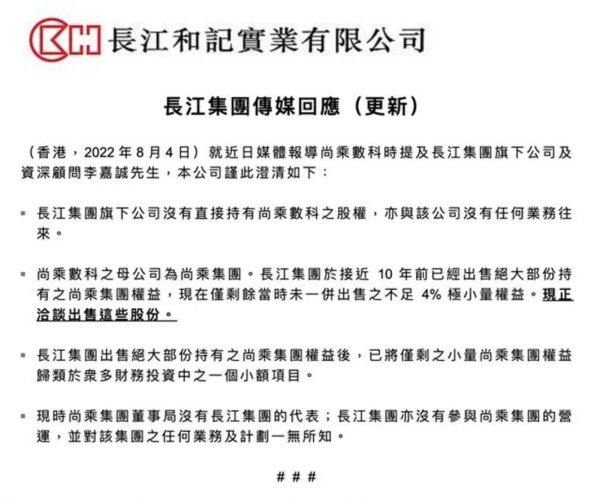 因为早期由李嘉诚旗下的长江和记创立,李嘉诚也成为尚乘数科上市前后一个重要的炒作“标签”,但从8月4日长江和记的澄清公告来看,其虽然仍持有尚乘集团不到4%的股权,即间接持有尚乘数科大约3.5%的股权,但因为不是直接持股,无法通过刺激后者股价上涨直接实现套现。
